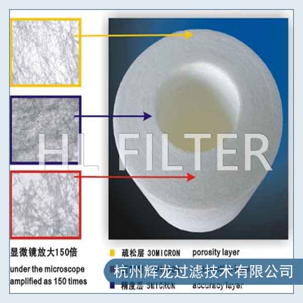 PP棉濾芯采用無毒無味的聚丙烯粒子,經(jīng)過加熱熔融、噴絲、牽引、接受成形而纏繞粘結(jié)的管狀濾芯。過濾最高精度可達(dá)1μm,濾芯的結(jié)構(gòu)由外向內(nèi)層級過濾,越靠近濾芯里層,孔徑越小,過濾的精度也越高。PP棉具有流量大、耐腐蝕耐高壓低成本等特點(diǎn),主要用于阻擋水中的鐵銹、泥沙、懸浮物等大顆粒物質(zhì)。