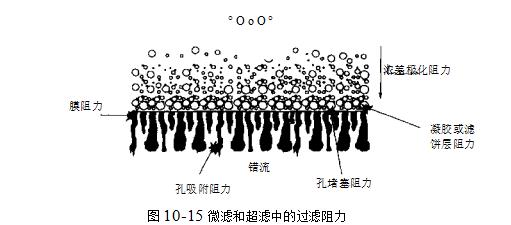 在膜過濾中,對于滲透液的流動有幾種阻力由圖10-15給出最著名的阻力就是濃差極化阻力.如果膜成功地將懸浮物在其表面截留下來,那么在膜表面和大量進(jìn)入的懸浮液之間勢必會產(chǎn)生濃度梯度.