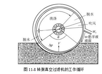 轉(zhuǎn)鼓真空過濾機(jī)如圖11-4所示,它的過濾表面通常位于圓柱形轉(zhuǎn)鼓的外表面;然而, 有的轉(zhuǎn)鼓真空過濾機(jī)的過濾面在轉(zhuǎn)鼓內(nèi)表面。在第二種情況中,過濾后的固體沉積在垂直圓 盤的外表面,如圖11-5所示。