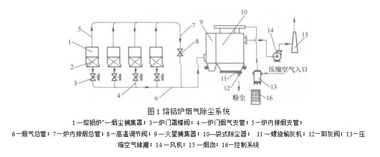 熔鋁爐除塵系統(tǒng)由煙塵捕集罩,輸氣管道及閥門,火星捕集器,袋式除塵器,風(fēng)機(jī),自動(dòng)控制系統(tǒng)等部件組成.