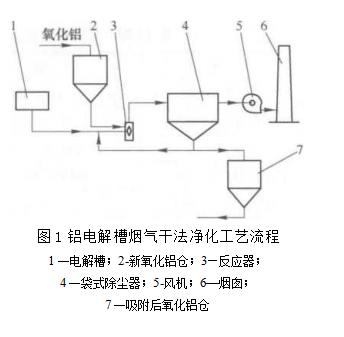 其煙氣干法凈化工藝流程:各電解槽的煙氣匯集在一起進(jìn)入反應(yīng)器,同時(shí)定量加入新鮮氧化鋁,然后進(jìn)入袋式除塵器.