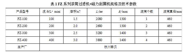 FZ系列滾筒過(guò)濾機(jī)+磁力刮屑機(jī)規(guī)格及技術(shù)參數(shù)見(jiàn)表1