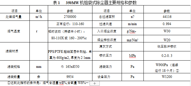 PPS纖維濾料最主要的用途是燃煤鍋爐煙氣除塵,是該領(lǐng)域首選的濾料。某企業(yè)自備電廠35OMW機(jī)組“電改袋”采用了 PPS濾料,袋式除塵器主要規(guī)格和參數(shù)列于表1。袋式除塵系統(tǒng)運(yùn)行半年后的測(cè)試結(jié)果:煙塵排放濃度為ll.O~ll.8mg/Nm。設(shè)備阻力為749 ~789Pa。運(yùn)行1年后將濾袋取樣進(jìn)行檢測(cè),超細(xì)PPS面層針刺氈的經(jīng)向和緯向斷裂強(qiáng)力以及透氣度等主要指標(biāo),都與新濾料相當(dāng);袋式除塵器連續(xù)運(yùn)行2年時(shí)檢測(cè),煙塵排放濃度小于20mg/Nm3,濾袋阻力為700?900Pa。根據(jù)檢測(cè)結(jié)果預(yù)計(jì)濾袋使用壽命可達(dá)4年。