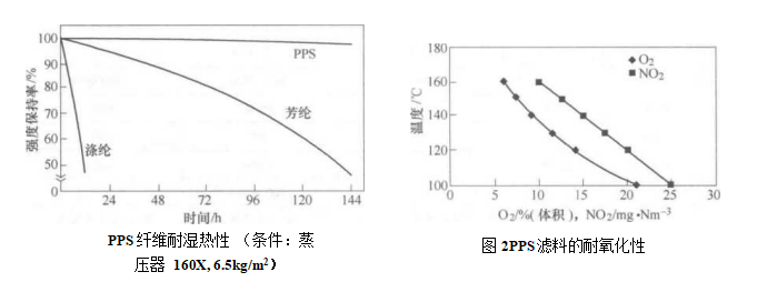 PPS的缺點(diǎn)是耐氧化性能差,可因,2和NO?而氧化降解、強(qiáng)度下降和變色發(fā)脆,甚至濾料纖維層破碎而脫離基布。PPS的耐熱性隨。濃度的增加而降低(圖2) 。